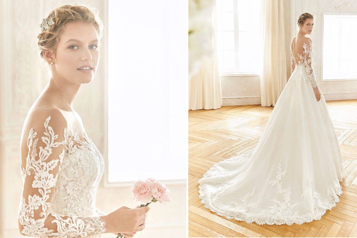 Como num conto de princesas, este fabuloso vestido de noiva em tule e renda potencia o volume da saia que contrasta com o decote e as mangas em tule ilusão: