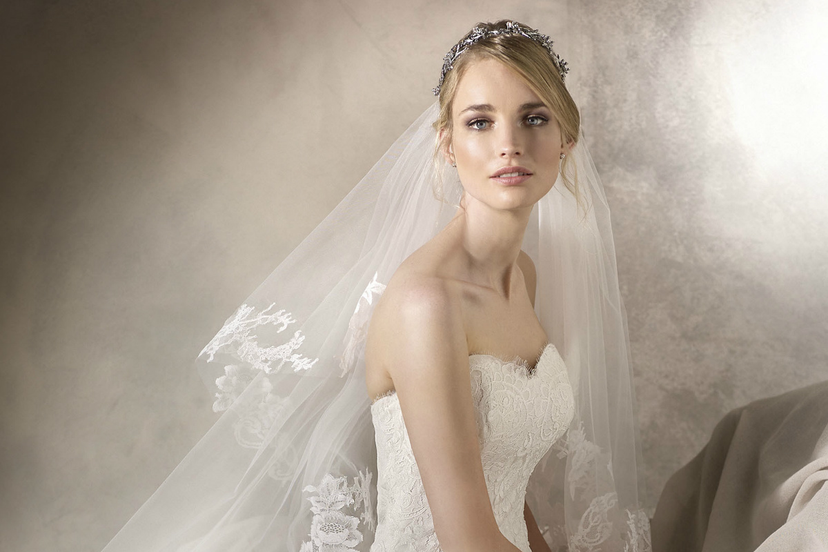 Requintado vestido de noiva estilo princesa em tule, com decote em coração. A renda decora o decote e todo o vestido, conferindo um ar muito romântico, rematado por umas costas com elegantes botões.