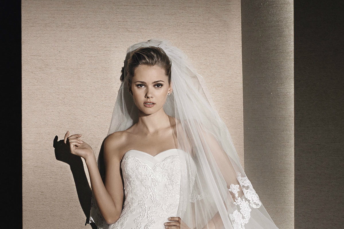 Vestido de noiva em tule com aplicações em guipura estilo sereia. Corpo de decote em coração acabado com tule drapeado.