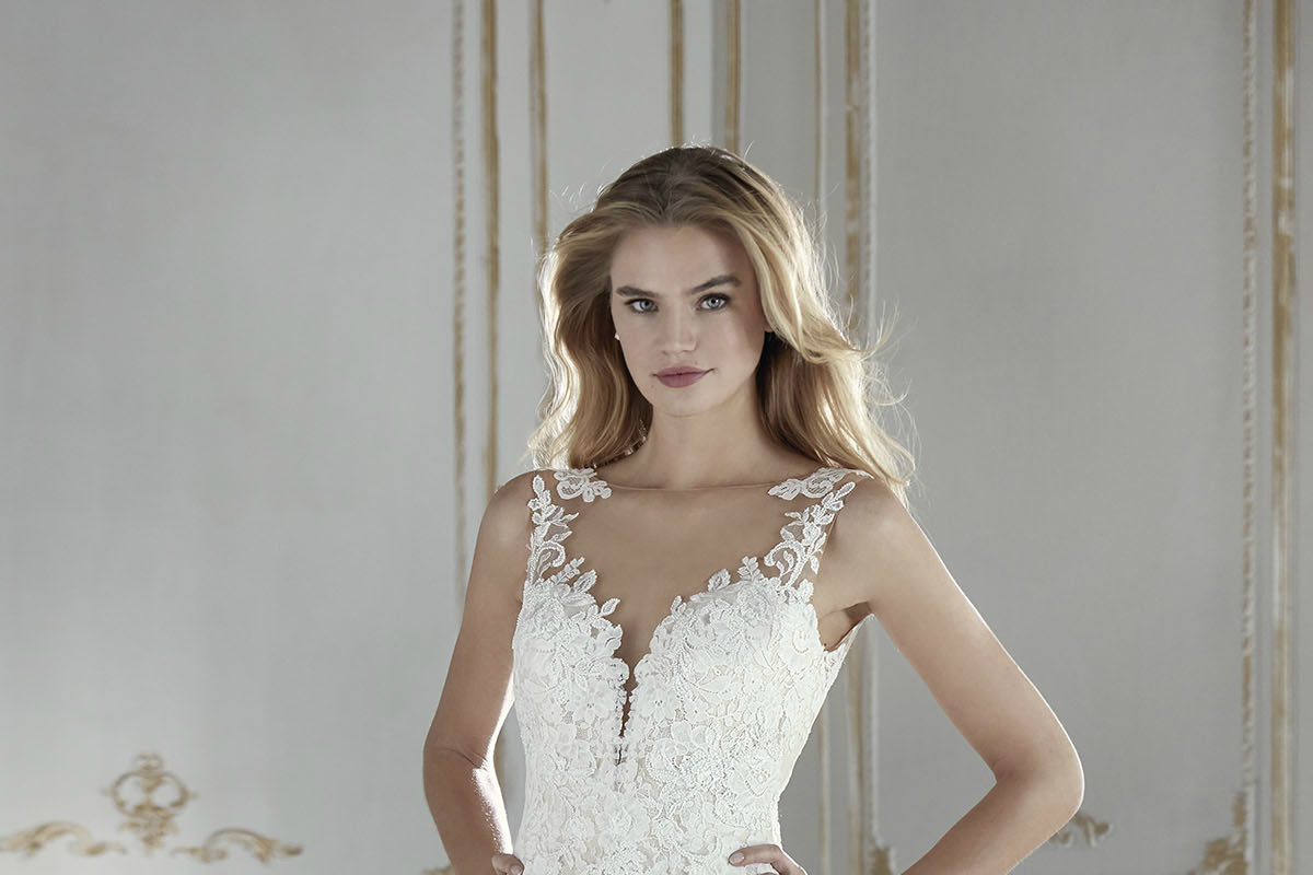 Fabuloso vestido de noiva corte sereia em renda e tule bordado com aplicações de pedraria. Um modelo muito feminino que acentua a sensualidade com a grande abertura central na saia e o decote em v no peito e nas costas. Dois decotes com placement de renda que debruam o decote fundindo os motivos florais com a pele. Um modelo moderno e muito romântico.
