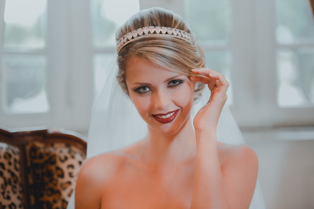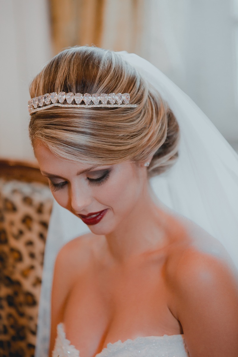 Nossas grinaldas deram um brilho a parte, coroando a noiva. Um detalhe ao véu, que é sempre uma escolha muito pessoal e de personalidade. Para este optamos por um curto, com camadas, bastante leve para harmonizar com o vestido, que apesar de volumoso também tem leveza, e sua saia acompanha o bordado em pedrarias do corselet.